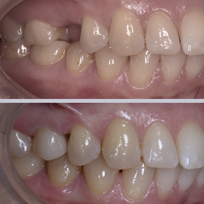 Восстановлена утраченная функция жевания, достигнут высокоэстетичный результат, коронка визуально не отличается от естественных зубов. Пациент получил комфортное, стабильное и долговременное решение, не требующее дополнительных вмешательств со стороны других зубов (в отличие от мостовидных протезов).