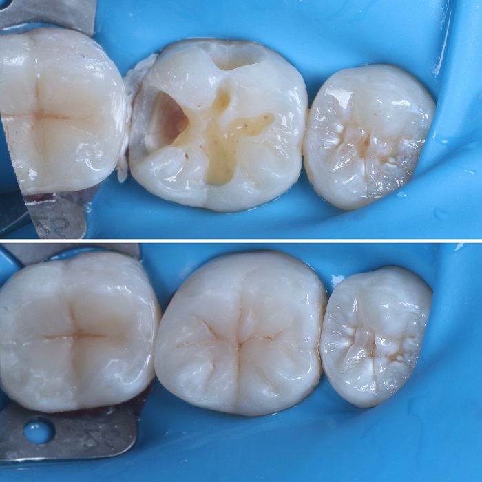 Старая пломба и пораженные кариесом ткани были полностью удалены с сохранением здоровых структур зуба. Образовавшаяся полость была очищена, обработана антисептиком и подготовлена к реставрации.