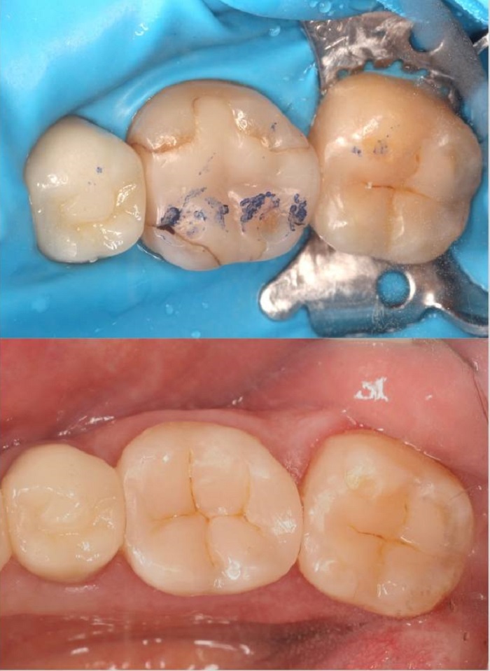 Реставрация выполнена с применением послойной техники с использованием наногибридного композита, обладающего высокой износостойкостью и эстетикой. Анатомическая форма фиссур и бугров была тщательно воспроизведена с учетом окклюзионных контактов, чтобы восстановить полную функциональность жевательной поверхности. Финально произведена полировка поверхностей зуба и проверка прикуса.
