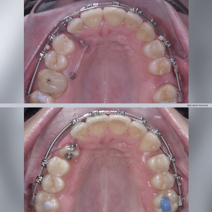 В течение 10 месяцев проводилось постепенное вытяжение ретинированного клыка с применением малых сил для предотвращения повреждения корней соседних зубов и сохранения здоровья их пародонта. Положение зуба регулярно контролировалось клинически и с помощью рентгенологических снимков. По окончании вытяжения зуба в зубную дугу произведена окончательная коррекция положения зубов, восстановлена правильная окклюзия (смыкание зубов), после чего назначен ретенционный этап с использованием индивидуальных кап для поддержания результата.