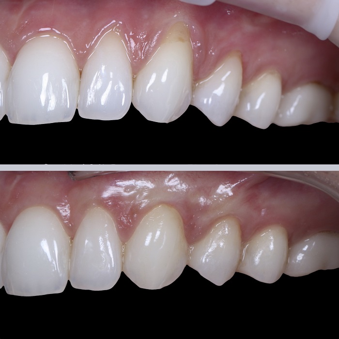 Проведена хирургическая коррекция методом транспозиционного (перемещаемого) лоскута с одновременной пластикой аутогенным мягкотканным трансплантатом, взятым с твердого неба пациента. Такая методика обеспечивает надёжное покрытие оголенных корней, восстановление физиологического контура десны и увеличение толщины мягких тканей, что повышает устойчивость десневого края к травмам и воспалениям.